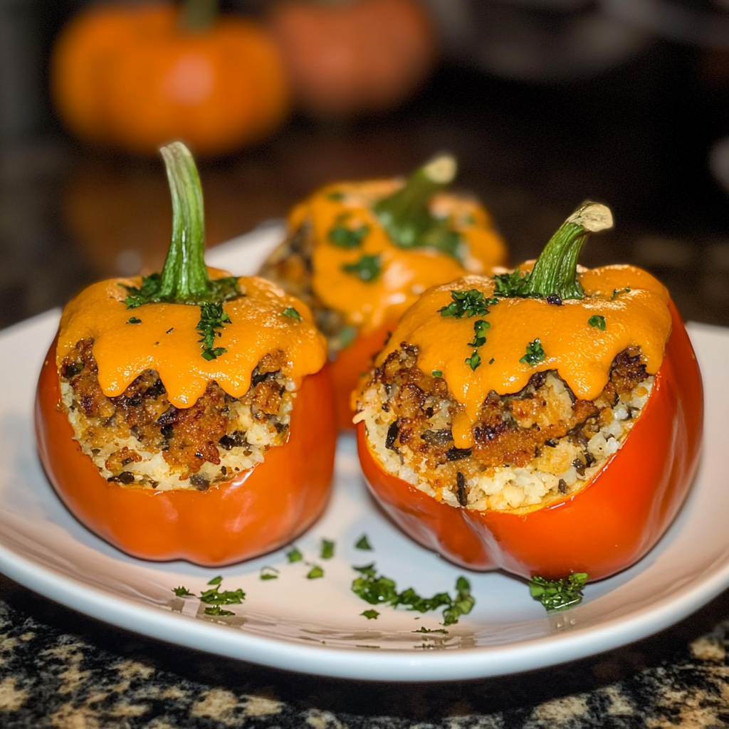 Spooktacular Shredded Chicken & Rice Stuffed Peppers