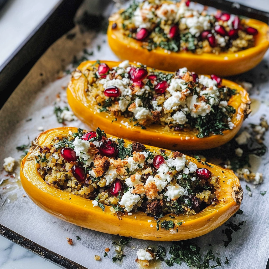 Cozy Quinoa Stuffed Butternut Squash with Pomegranate Seeds