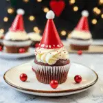 Prepare your creamy frosting by beating softened butter with powdered sugar until fluffy. Add heavy cream gradually until achieving your desired consistency. Pipe or spread generously onto cooled cupcakes—don’t forget that iconic Santa hat shape!