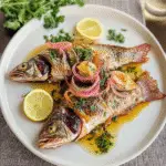 Once baked to perfection, transfer your whole fish onto a serving platter. Drizzle more olive oil over it and garnish with additional herbs and lemon slices if desired. Voilà! A masterpiece ready to impress!