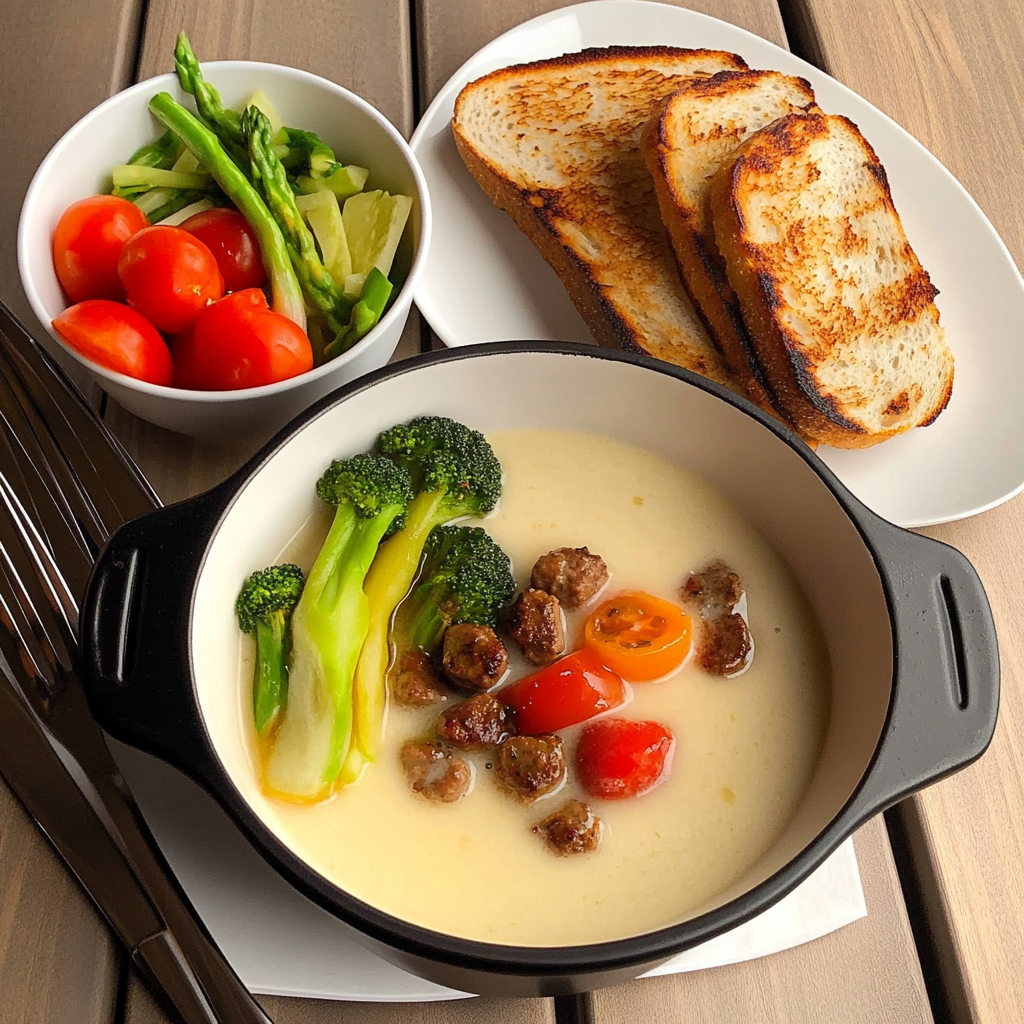 Cheese Fondue with Veggies and Toast is the ultimate interactive comfort food, perfect for gatherings or cozy nights in. Picture colorful, crunchy vegetables and crispy bread eagerly dipping into a bubbling pot of rich, melted cheese. This delightful dish not only satisfies cheese cravings but also fosters connection and fun among friends and family, making every bite a memorable experience.