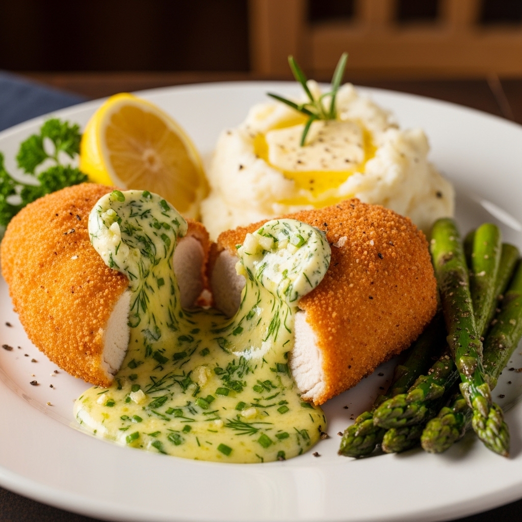 Chicken Kiev pairs beautifully with various sides. You might consider serving it alongside creamy mashed potatoes or a fresh garden salad. Roasted vegetables or garlic bread also complement this dish well. Chicken Wellington with Dijon Cream Sauce The goal is to balance the rich flavors of the Chicken Kiev while providing a refreshing contrast to its buttery goodness.