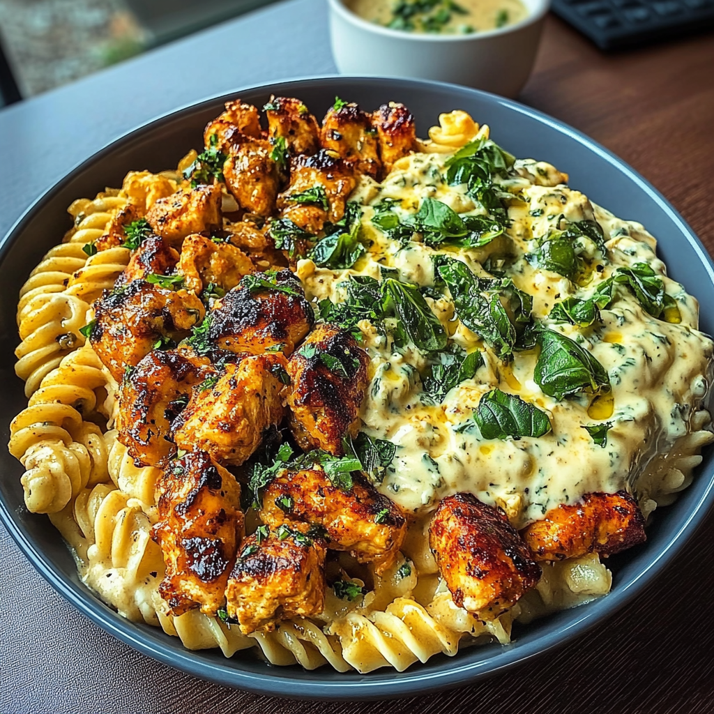 Hot Honey Cajun Chicken Alfredo with Basil Feta Swirl & Crispy Brussels Chips delivers a flavor explosion that dances on your taste buds. Picture this: creamy, spicy, sweet, and crunchy all in one bite. It’s like a party in your mouth where every ingredient brings its A-game.