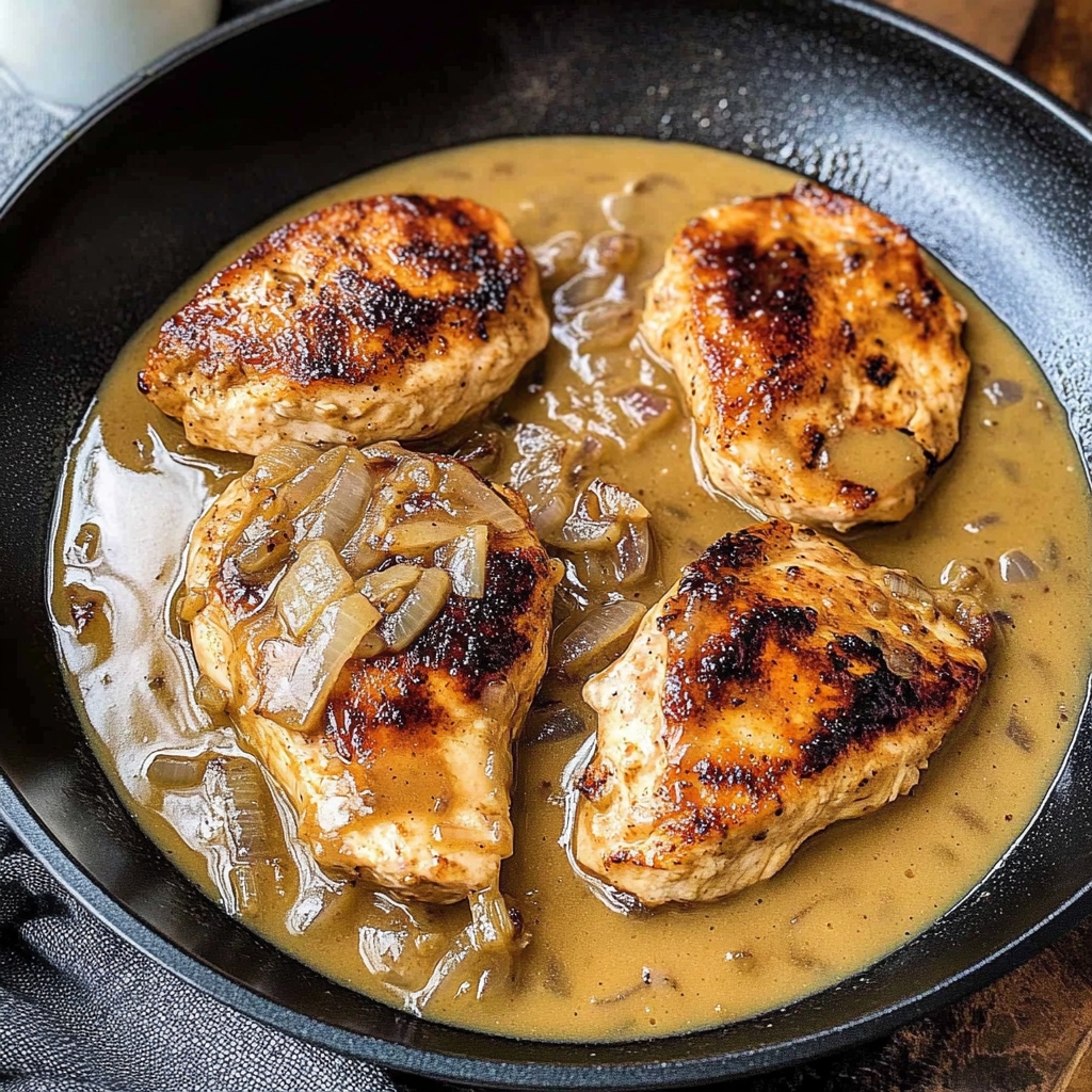 Start by searing the chicken breasts until golden brown, then set them aside. Cook the onions until caramelized, add garlic, and deglaze with broth. Return the chicken to the pan and let it simmer in that savory gravy.