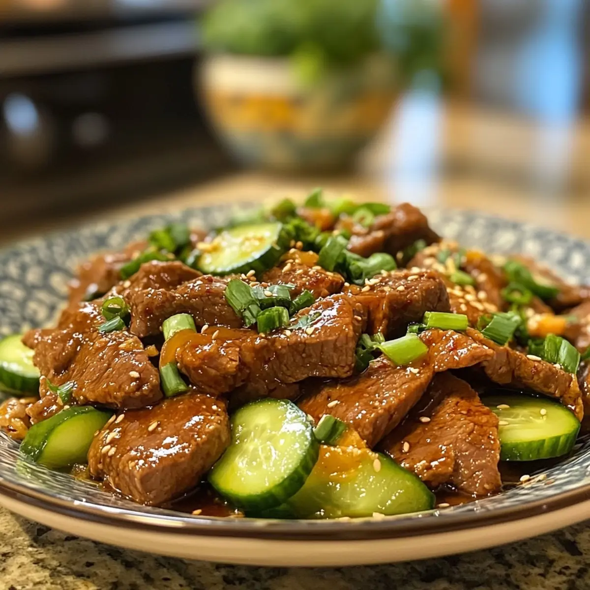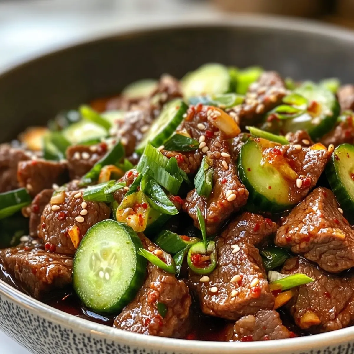 - Plate the spicy Korean beef alongside the refreshing cucumber salad and garnish with chopped green onions.