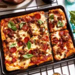This pizza isn’t just food; it’s an experience. Remember those pizza nights with family or friends where laughter filled the room and everyone shared stories over their favorite toppings? This Sheet Pan Meat Lovers Pizza is the perfect way to recreate those moments, making it ideal for game nights, casual gatherings, or any day ending in “y.” You’ll soon find yourself promising to make this dish again and again as you savor every last cheesy bite. easy side dish for pizza meals. For more inspiration, check out this irresistible garlic shrimp recipe recipe.