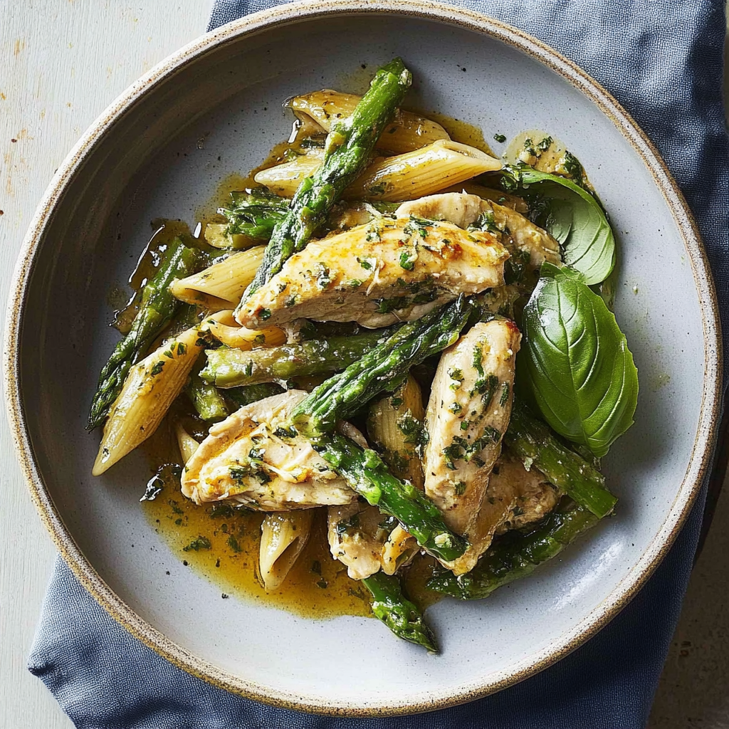 6. Drain pasta and return it to the pot. Slice cooked chicken into bite-sized pieces and toss with roasted asparagus into the pasta. Pour sauce over everything, mix well, and serve hot.